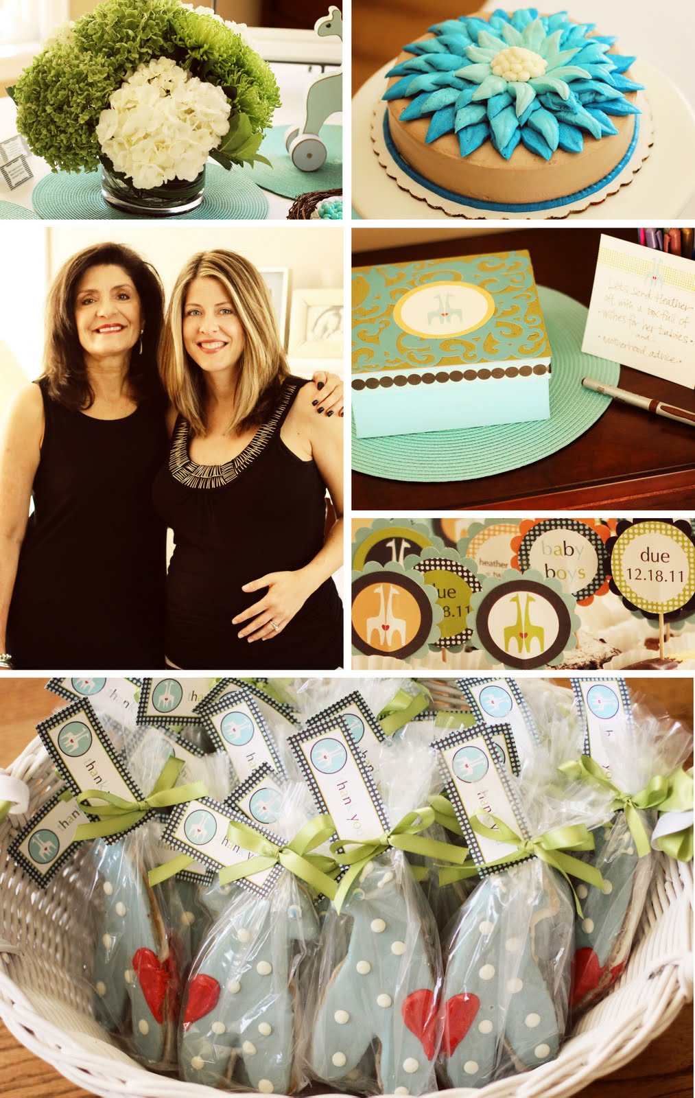 In terms of decor, nearly everything for this party was handmade. Elaine designed the gorgeous giraffe themed invitations, stationary and dessert picks and we planned the whole party around the theme “Oh Boys” with the image of the giraffes facing one another, sharing one heart. The inspiration for the original design was the blue giraffe that you see on the food table, which Elaine already had in her son’s nursery. A simple color scheme of robin’s egg blue, lime green, and brown with pops of orange created a festive backdrop for the already lovely and cozy setting. Colorful handmade baby blocks which Elaine created hung from the dining room chandelier. Custom onesies strung over the fireplace on a clothesline displayed the theme “OH BOYS” and were anchored by the twin giraffes, one on each end. I created the diaper cake and a handmade keepsake box which both repeated the giraffe theme as did the stationary on which guests lovingly wrote motherhood advice and wishes for the baby boys.